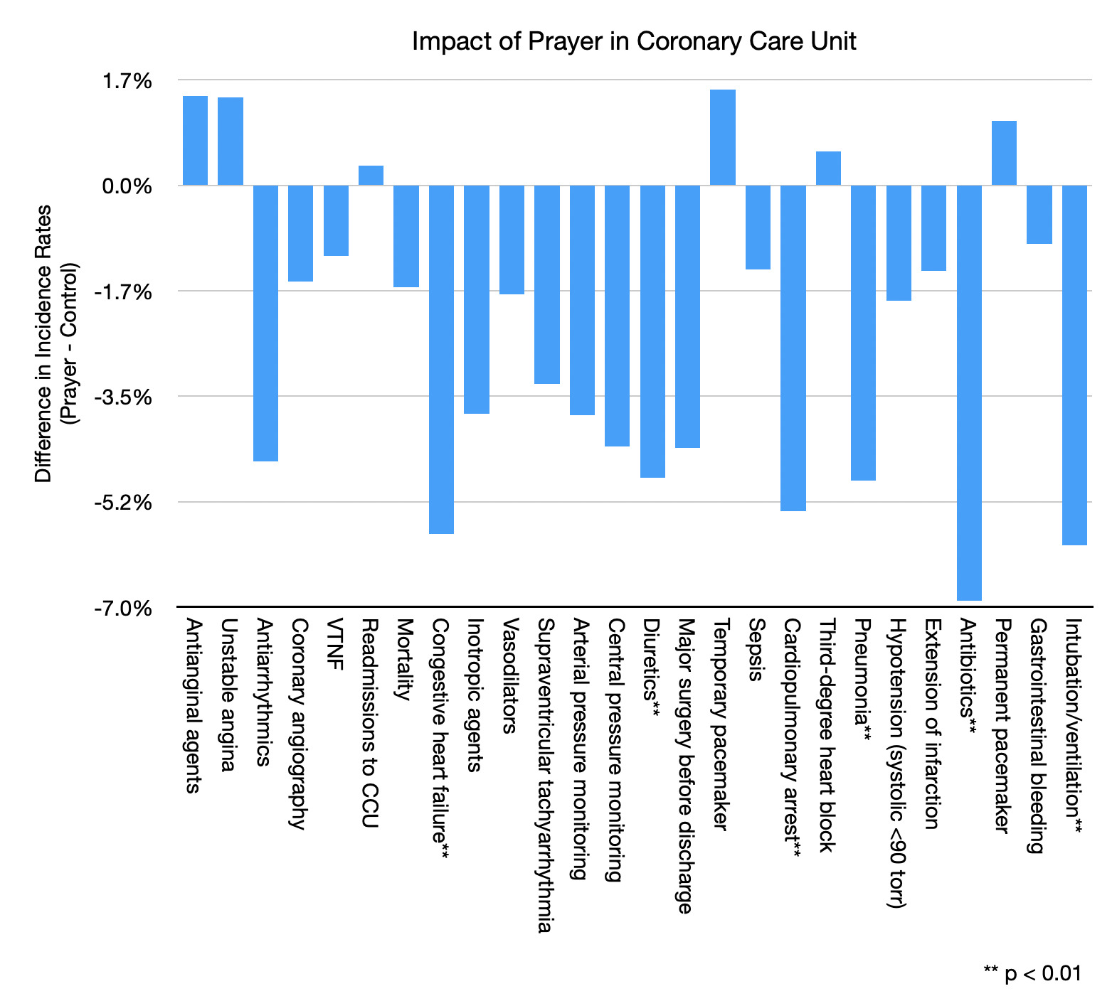 Prayer was associated with statistically significant (p < 0.01) reductions in the development of congestive heart failure, pneumonia, and cardiopulmonary arrest as well as in the use of diuretics, antibiotics, and intubation. A multivariate analysis of the data revealed near certainty (p < 0. 0001) that the observed differences are real—there is less than one-in-10,000 chance of such data emerging from groups with no actual difference. The changes in the incidence of all monitored events are shown in the chart below.